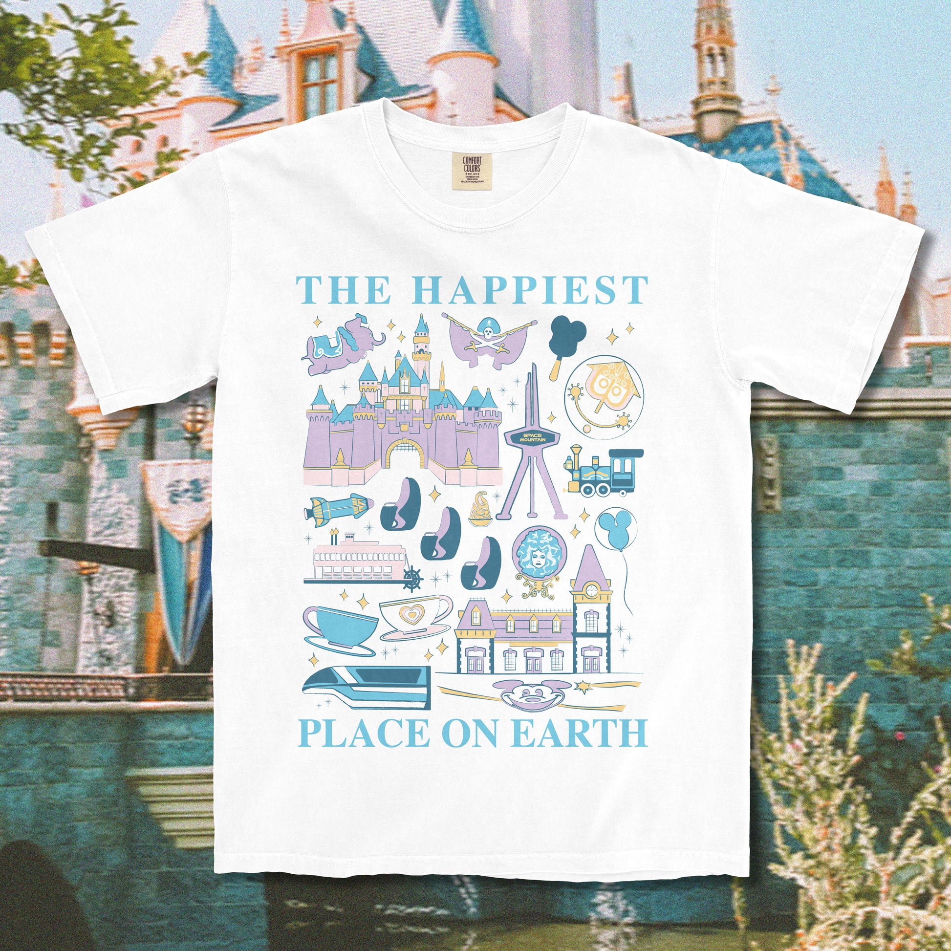 Embrace the magic with The Happiest Place on Earth Park Icons t-shirt. This shirt features iconic sights and landmarks that define the magical spirit of The Happiest Place on Earth. Crafted with care and printed on premium Comfort Colors fabric, it offers a one-of-a-kind aesthetic that will look great as the centerpiece of your next park day adventure.
