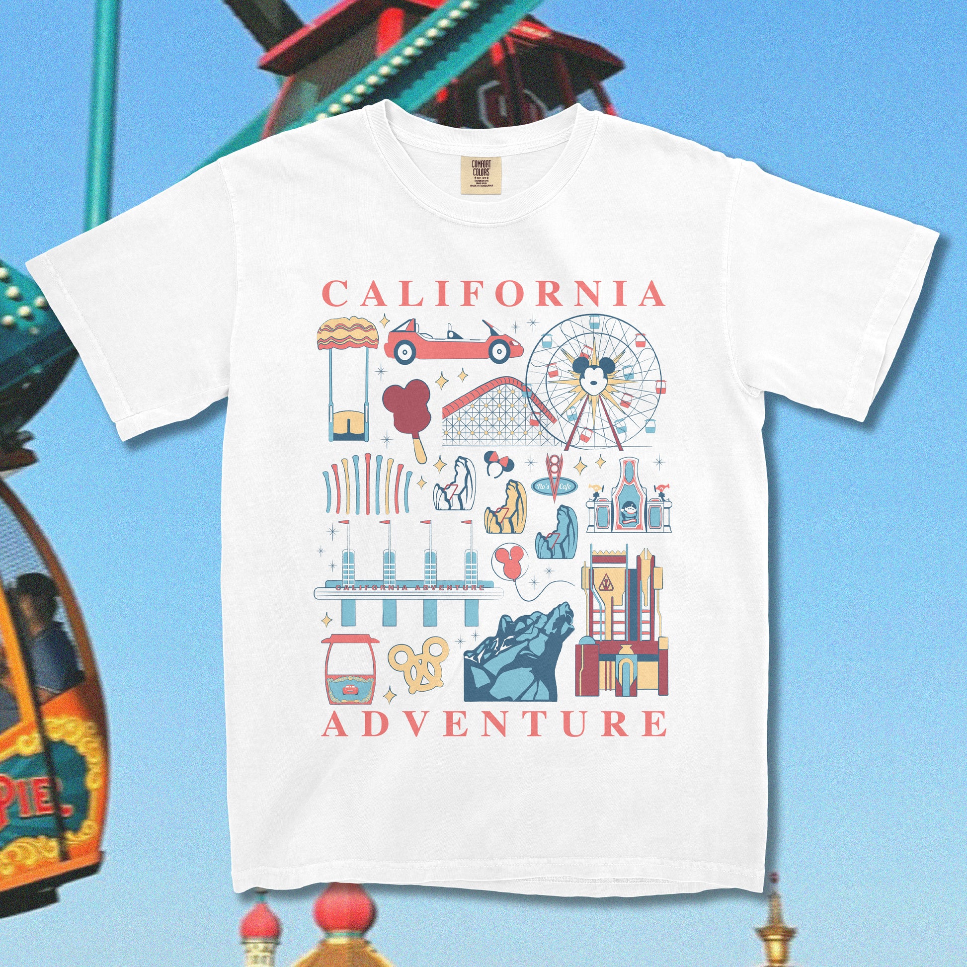 Embrace your sense of adventure with the California Adventure Park Icons t-shirt. This shirt features iconic sights and landmarks that define the adventurous spirit of California Adventure. Crafted with care and printed on premium Comfort Colors fabric, it offers a one-of-a-kind aesthetic that will look great as the centerpiece of your next park day adventure.