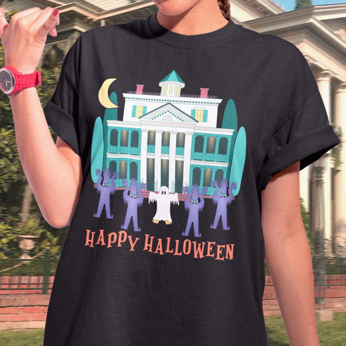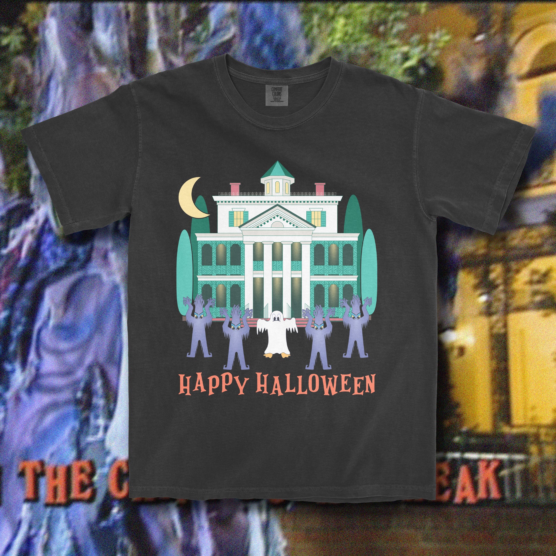 Well don't close your eyes and don't try to hide from this Happy Halloween Sing Along Songs t-shirt! This shirt features the recognizable Haunted Mansion segment from the iconic Sings Along Songs 90's VHS tape! Crafted with care and printed on premium Comfort Colors fabric, it offers a one-of-a-kind aesthetic that will look great as the centerpiece of your next Halloween time park day.