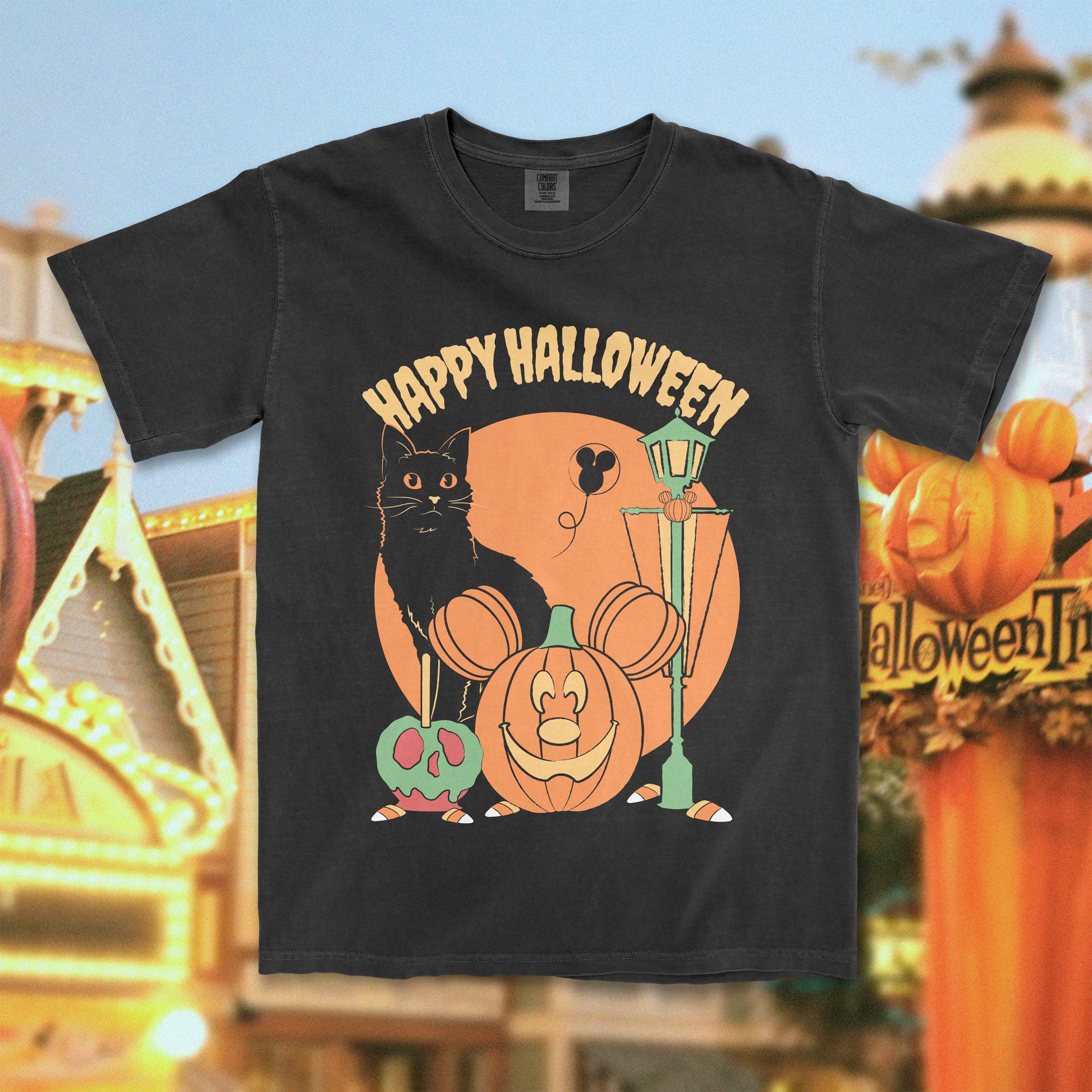 Embrace the spooky spirit of the season with our Happy Halloween t-shirt! This t-shirt features the mysterious aura that surrounds the enchanting night of Halloween, which is gurenteed to have you embracing the sprirt of spooky season! Crafted with care and printed on premium Comfort Colors fabric, it offers a one-of-a-kind aesthetic that will look great as the centerpiece of your next Halloween time park day.