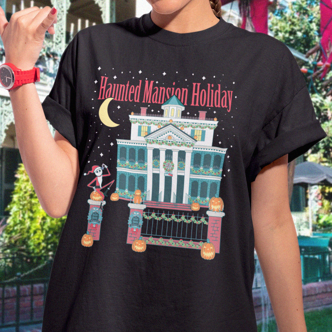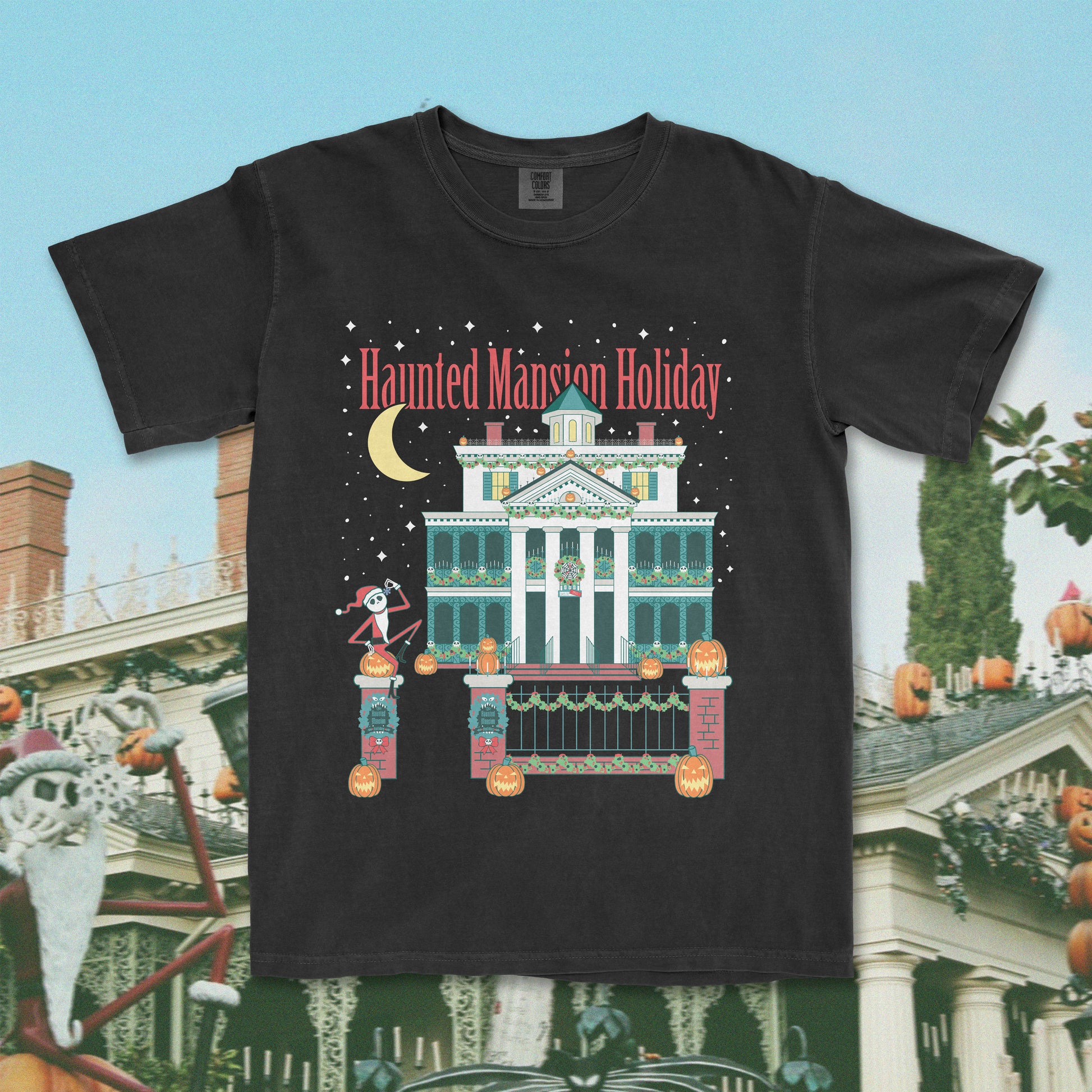 Embrace the enchanting fusion of Halloween and Christmas with our Haunted Mansion Holiday t-shirt! This shirt celebrates the classic Haunted Mansion Holiday overlay that is guarenteed to put you in the Halloween (and Christmas) spirit! Crafted with care and printed on premium Comfort Colors fabric, it offers a one-of-a-kind aesthetic that will look great as the centerpiece of your next holiday park day.
