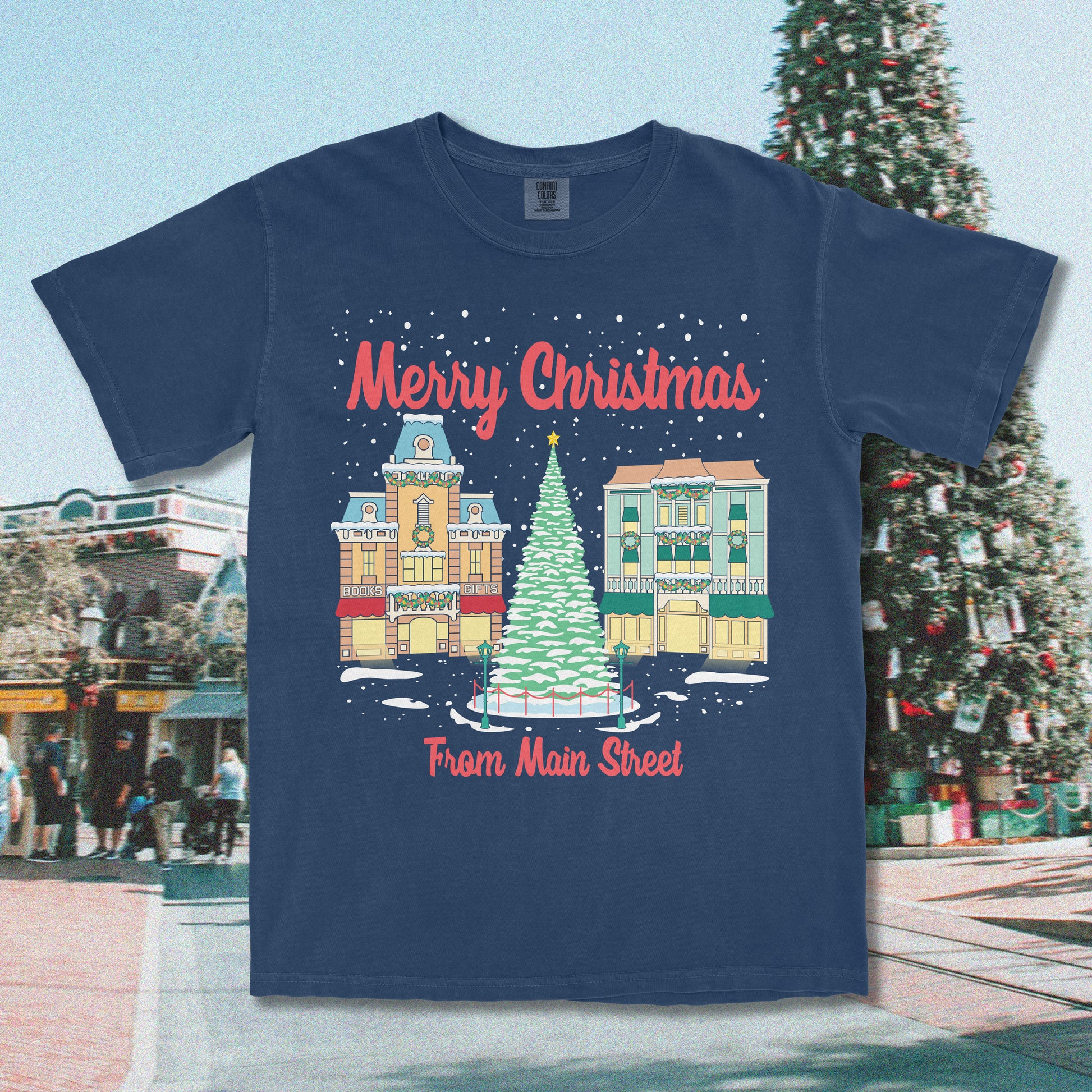 Take a holiday stroll down Main Street with our Merry Christmas from Main Street t-shirt! This shirt features the recognizable facades and Christmas decor of the iconic Main Street USA, which is guaranteed to have you embracing the holiday season! Crafted with care and printed on premium Comfort Colors fabric, it offers a one-of-a-kind aesthetic that will look great as the centerpiece of your Christmas time park day!