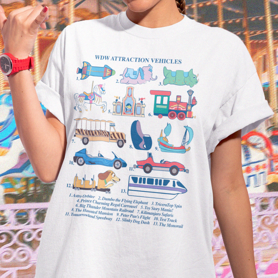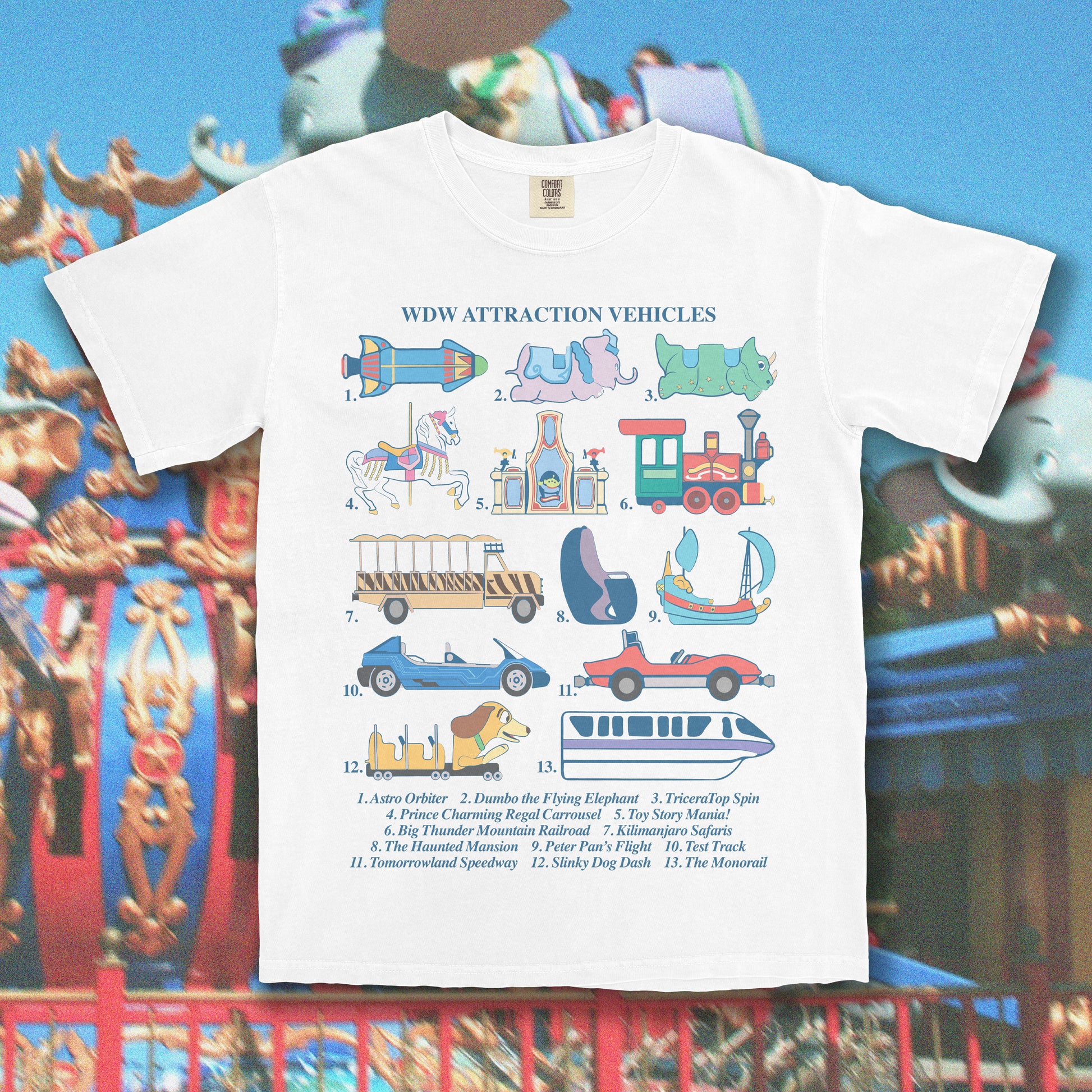 Show off your favorite rides with the Disney World Attraction Vehicles t-shirt! This shirt features the recognizable and nostalgic attraction vehicles that we all know and love! Crafted with care and printed on premium Comfort Colors fabric, it offers a one-of-a-kind aesthetic that is packed with detail and will look great as the centerpiece of your next magical park day.